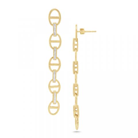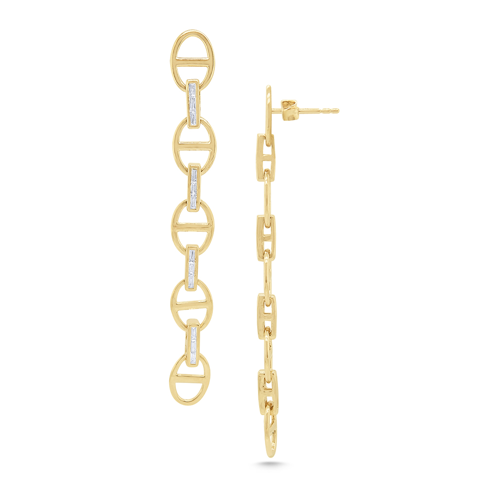 The modern mariner chain accented with baguette diamonds make up these swaying drop earrings.