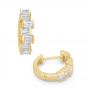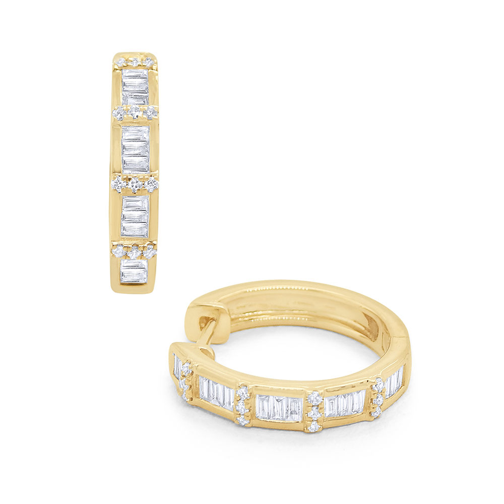 Round and baguette diamonds make up these modern huggie hoops earrigns. Pair up with some of our smaller studs for a personalized look.