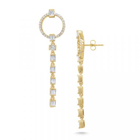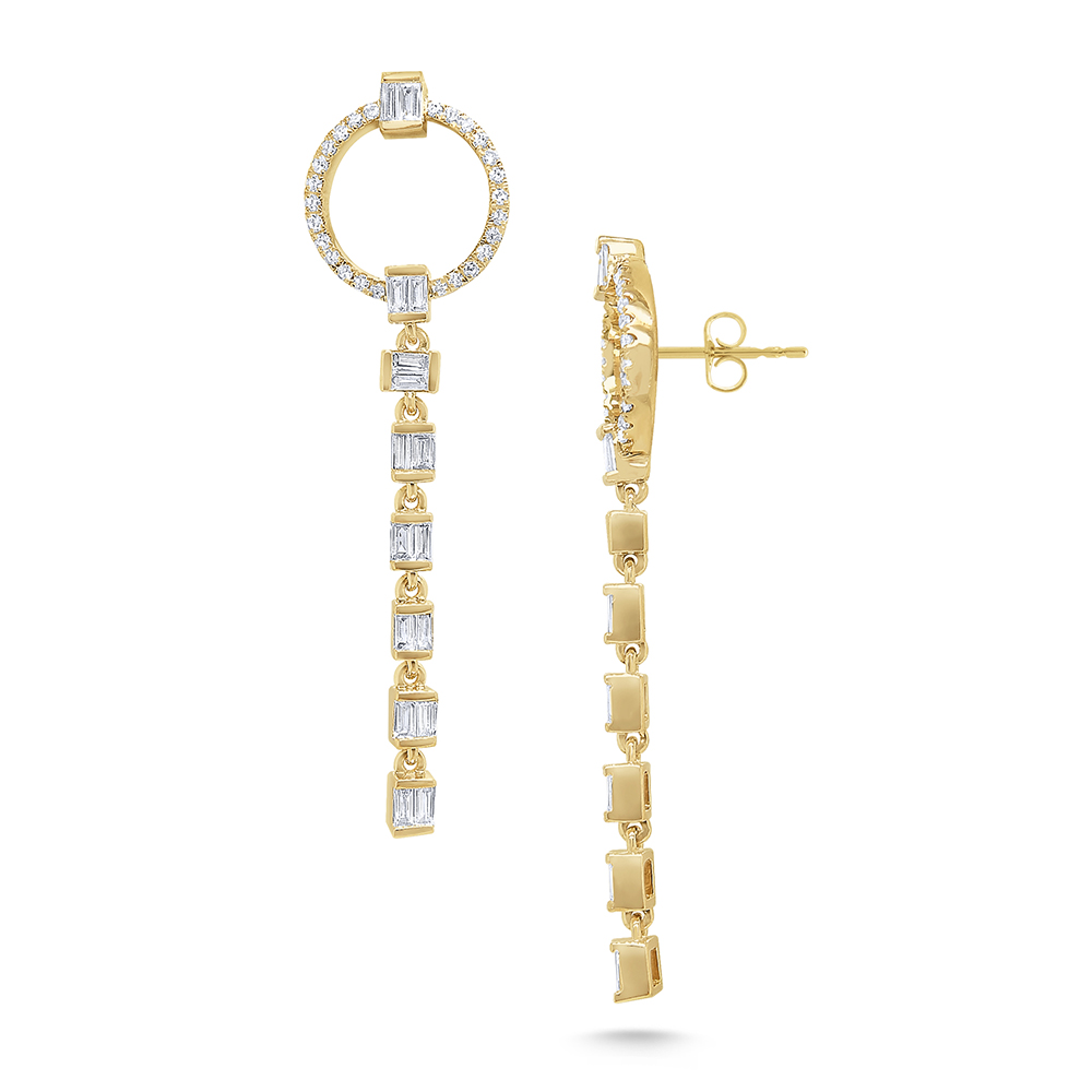 Baguette diamonds set in 14k gold swing playfully below a round diamond set circle.