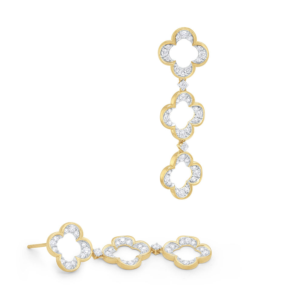 Three open diamond clovers dangle playfully below the ear in bold gold style. Pairs perfectly with any of our clover necklaces.