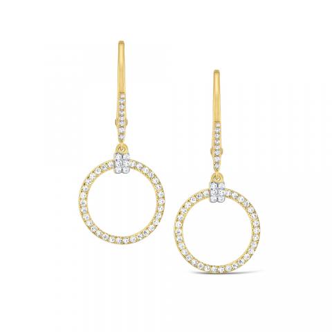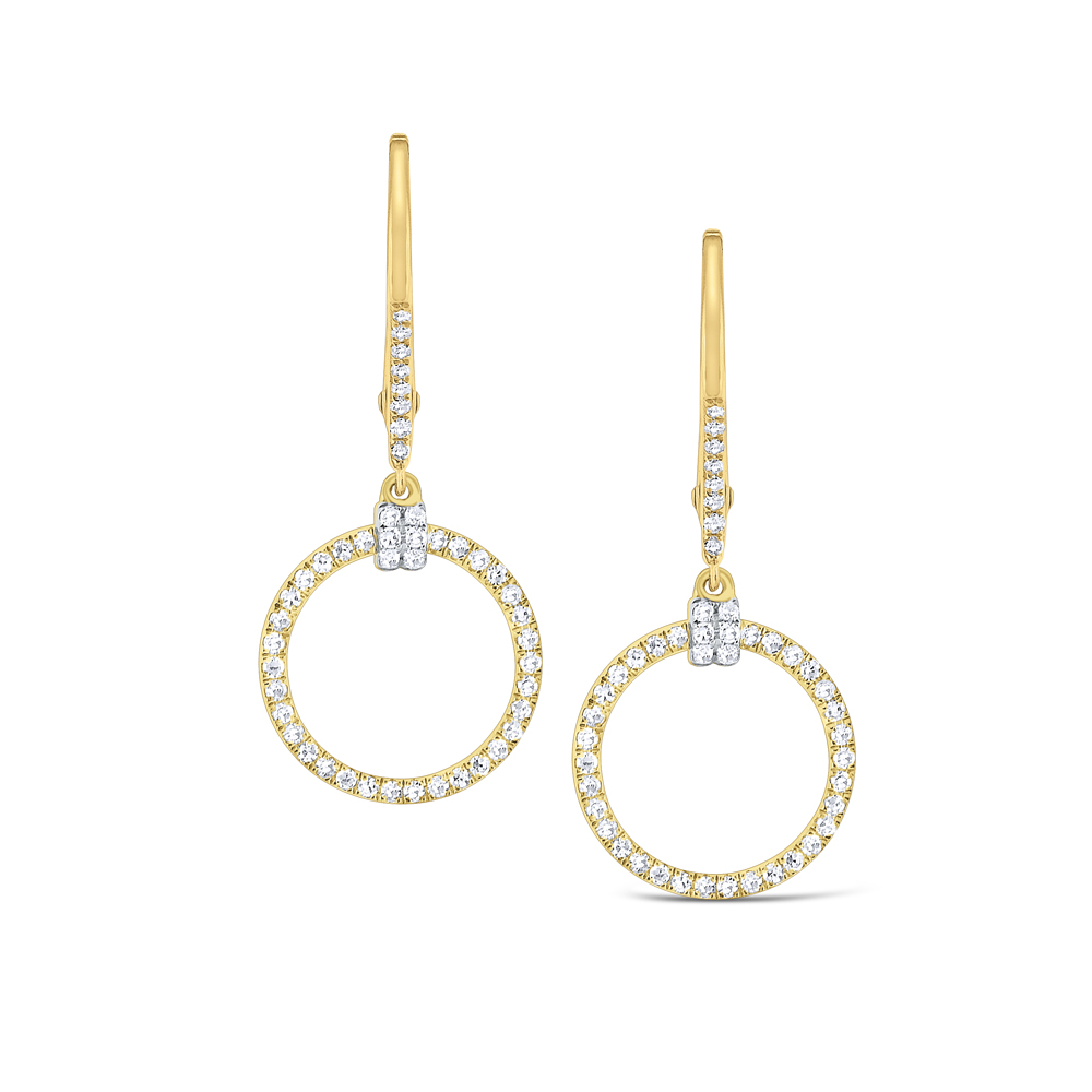 Round diamonds shimmer brilliantly as these circular frame earrings swing from your ear. Wear them with an up-do to really show them off!