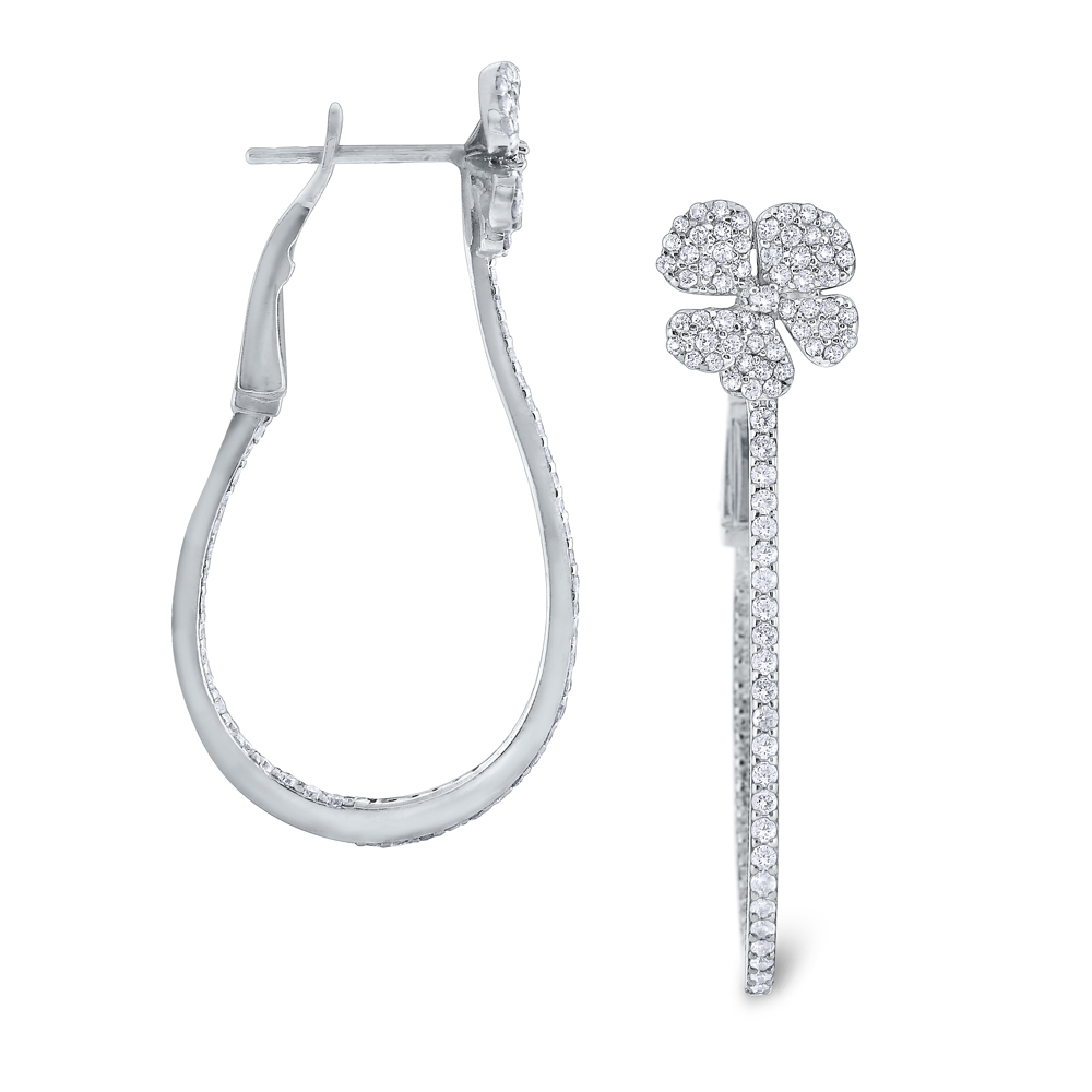 These earrings add a fun twist on traditional hoop earrings. Sparkling round diamonds hang in an oblong shape below a cute flower top. The flattering shape of these earrings go well with any look.