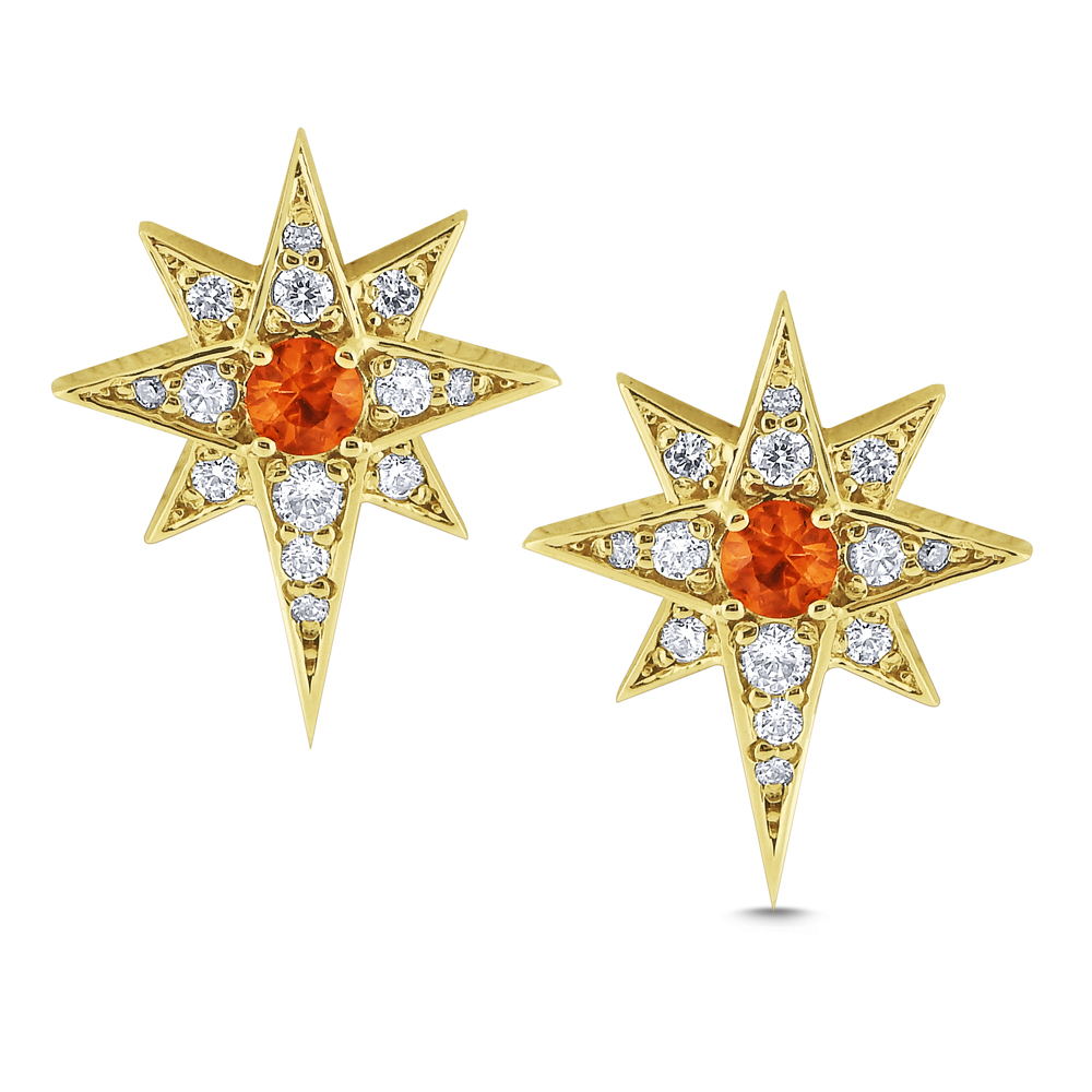 Shine like a star in these stylish celestial earrings! Fiery orange sapphires are framed by sparkling diamonds that glitter like the night sky.