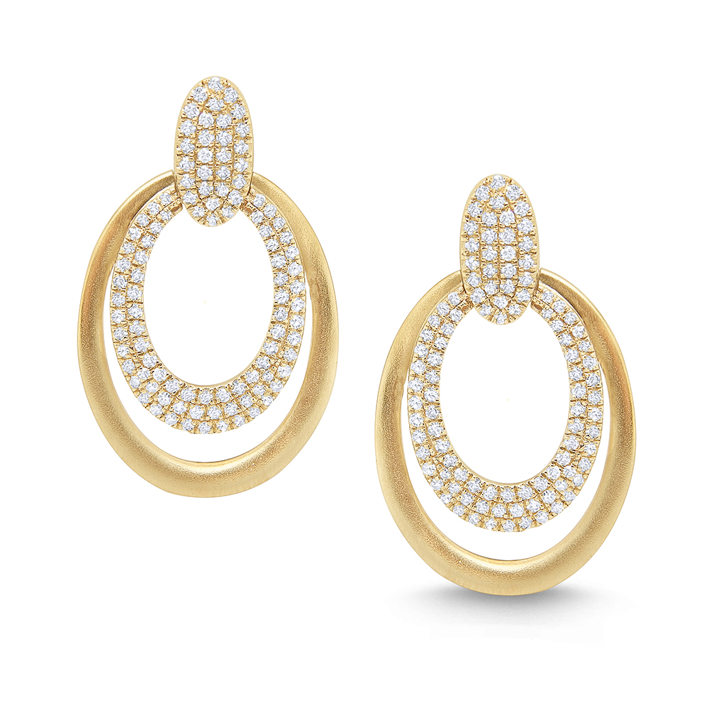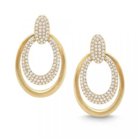 Two bold ovals swing below a diamond pave stud. The gold has a soft satin finish adding a modern touch to a simpe yet classic design.