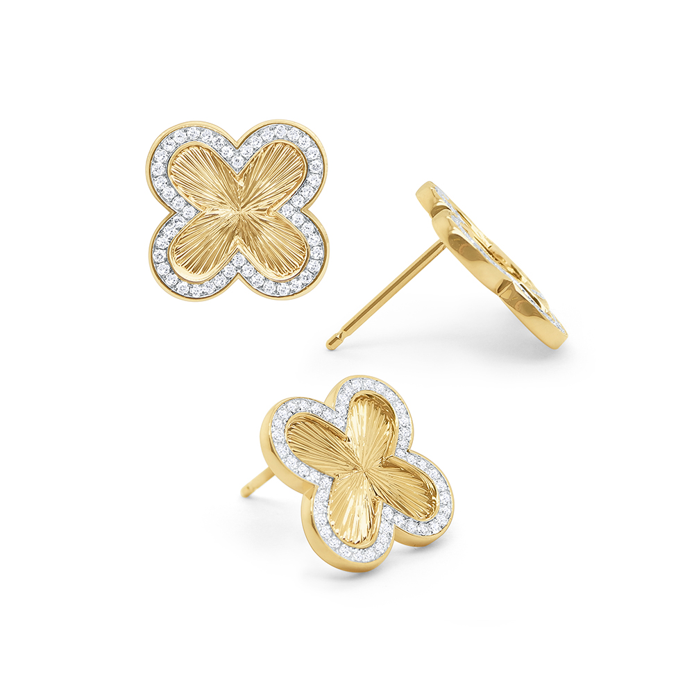 Lucky charms never looked so good. Sparkling diamonds frame a modern golden sunray clover. The perfect accessory for spring.