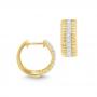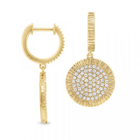 We've designed a modern update to the classic pave disc earring. Pave diamonds are set in 14k gold surrounded by a textured border that dangle below a diamond huggie.