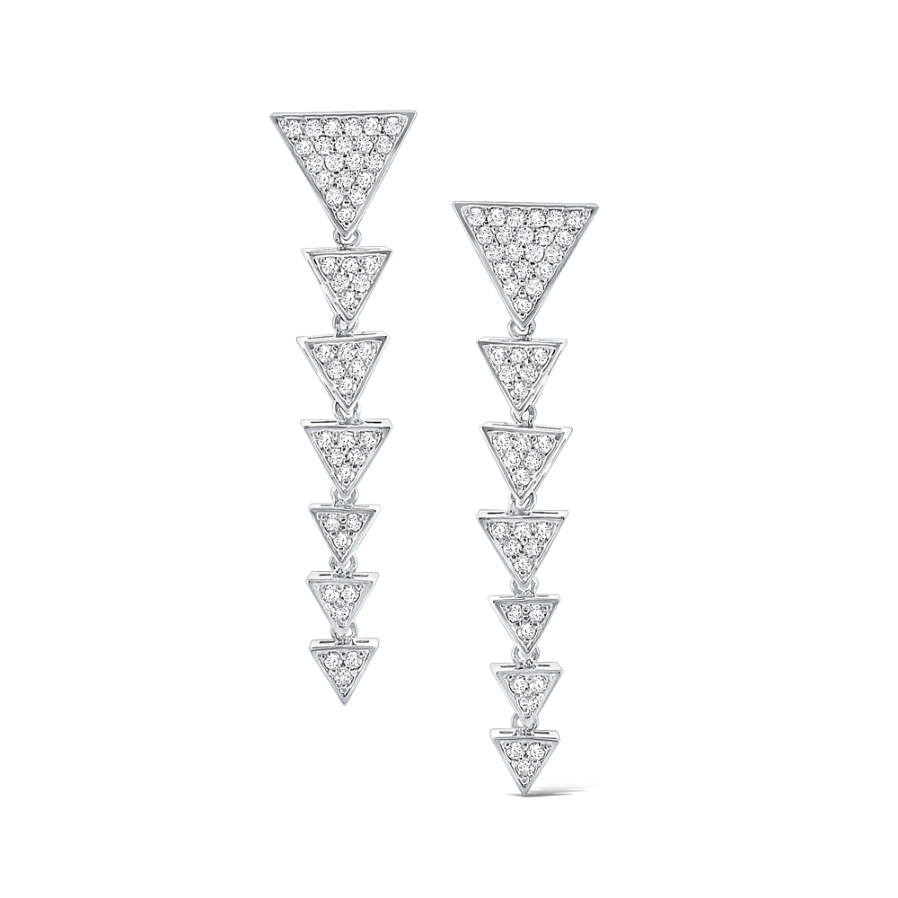 These daring earrings will put you in the spotlight! 7 diamond pavé triangles hang from each ear in an edgy fashion that is sure to get you noticed.