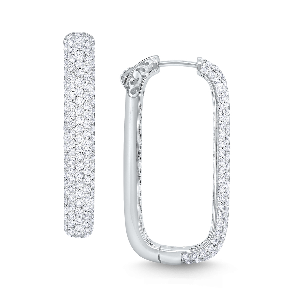 Large pave hoops take on a new look with a bold rectangular shape. These will surely turn heads!