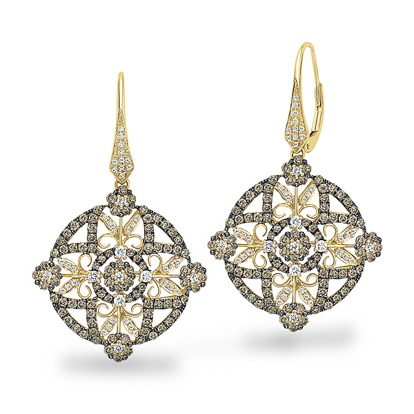 If you are heading to a glamorous and fancy affair, you will want to look your best right down to the finest detail. These champagne and white diamond fashion earrings are delicate and intricate and they give the perfect finishing touch to your evening wear. They have 268 sparkling 2.85 ct tw diamonds and are shown here in yellow gold and black rhodium.