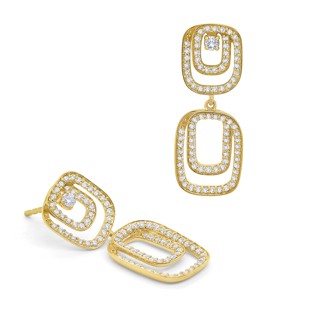 Diamonds set in golden lines create two spiral shapes where one dangles below the other. A very hip contemporary earring to add to your fine jewelry collection.