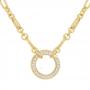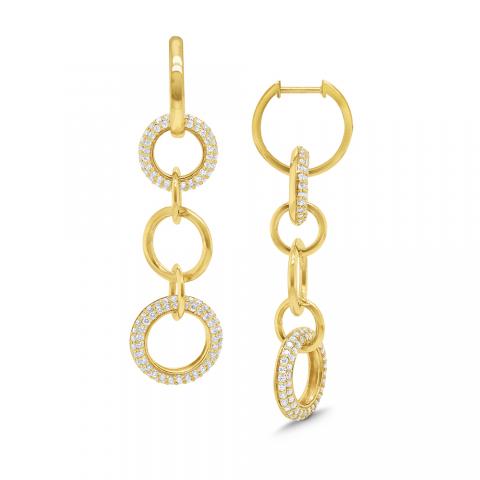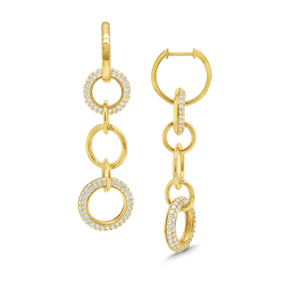 Alternating gold and diamond pave circles swing below a golden hoop. The perfect compliment to trending bold link chains.