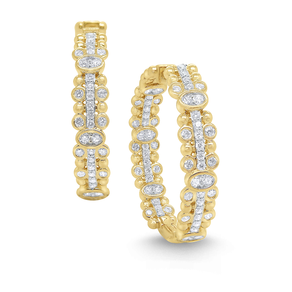These stunning hoops are not your classic inside out hoops. A central row of diamonds is framed on either side by alternating golden spheres and bezel set diamonds.