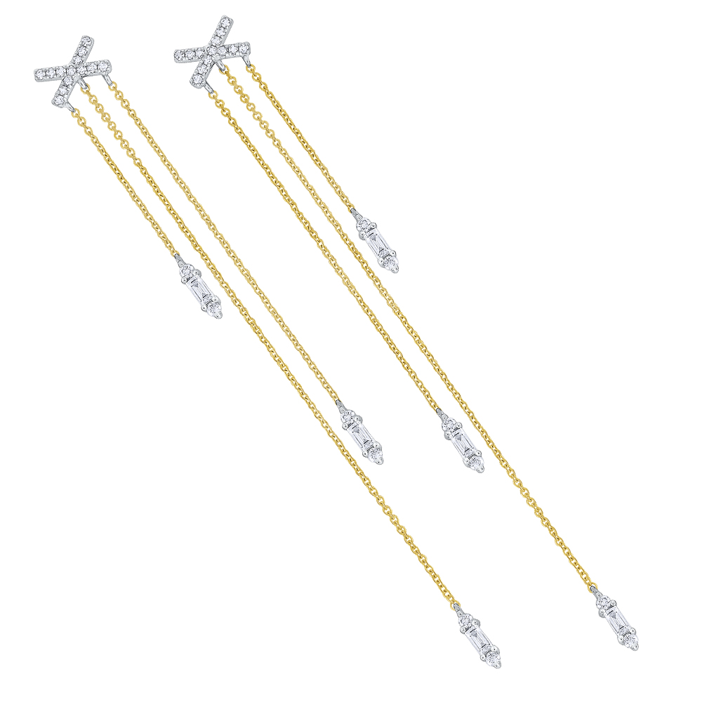 Dare to dazzle in these edgy earrings. Glittering baguette diamonds hang from 14 kt. gold chains below cool diamond X shapes.