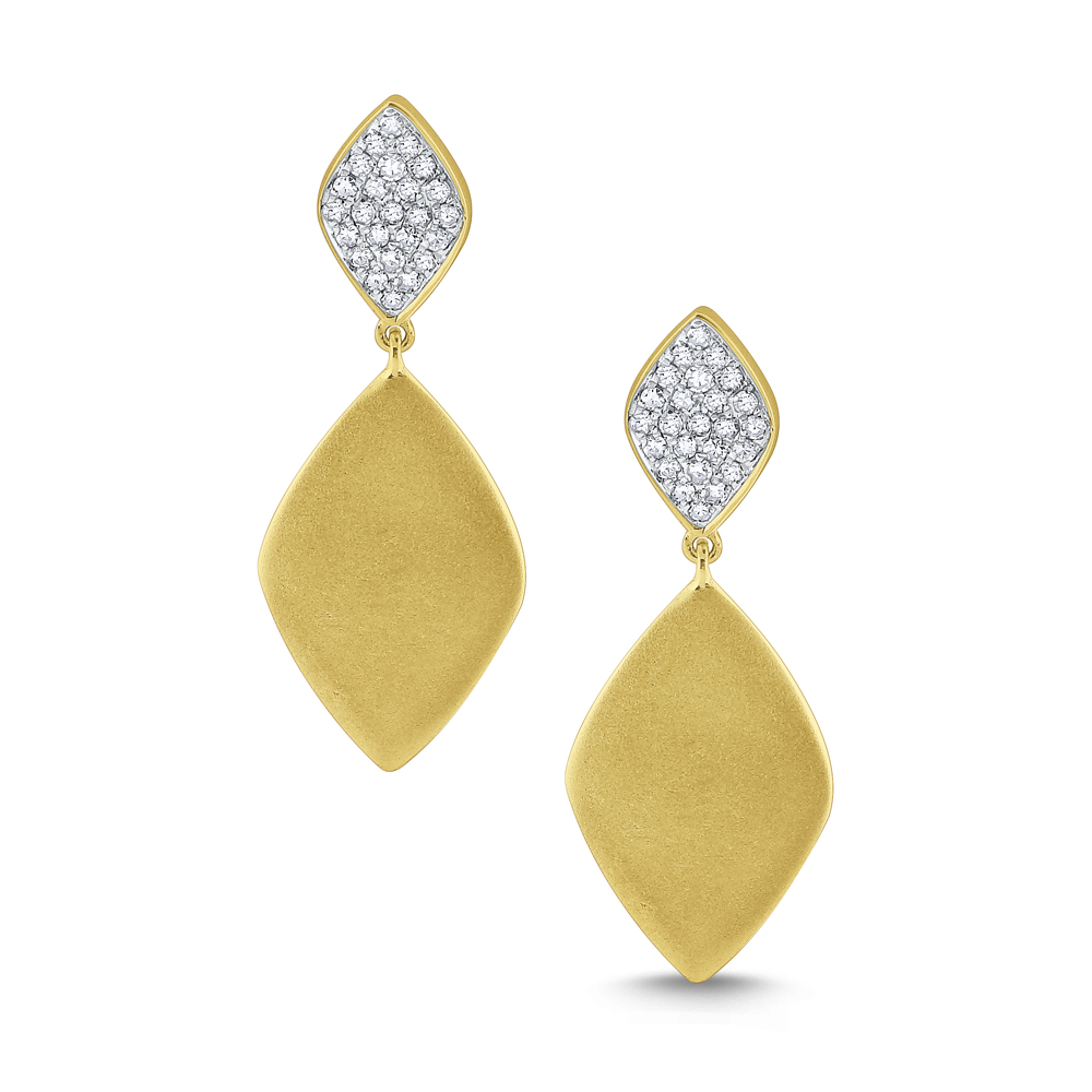 Dare to dazzle in these fun everyday earrings. Glittering pave diamonds are paired with tags of soft brushed 14 kt. gold.