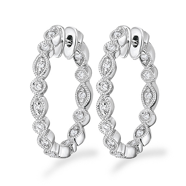 Are you looking for a bold and creative take on the diamond hoop earring trend that is so hot right now? These beautiful diamond inside outside hoop earrings have a very original setting that will make them stand out from the rest and will garner a lot of compliments. Featuring 28 .20 ct tw diamonds and shown here in white gold.