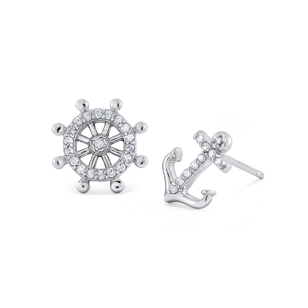 Take the wheel and throw the anchor! Our latest pair of mix match studs, diamond ships wheel and anchor studs.