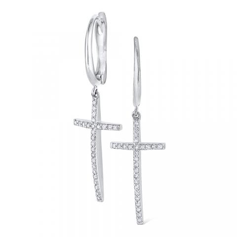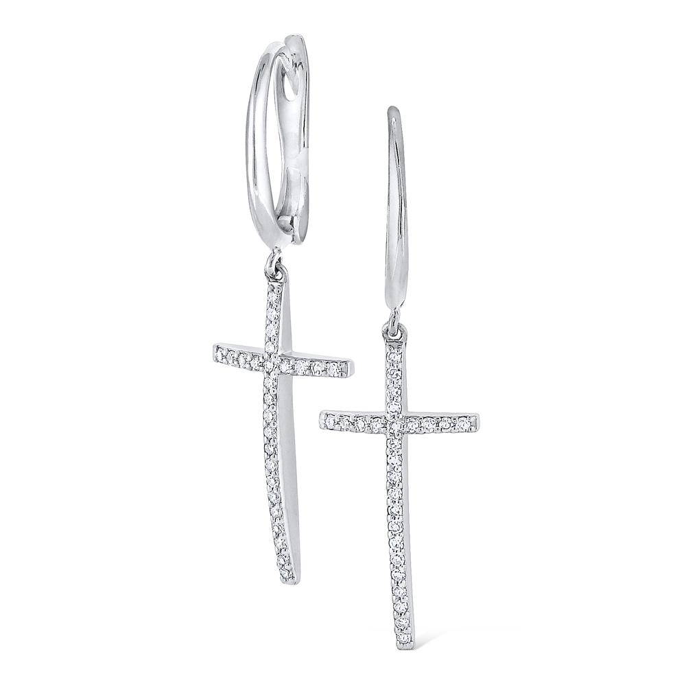 These simple gold hoops delicately drop elongated diamond cross charms that gracefully dangle below the ear.