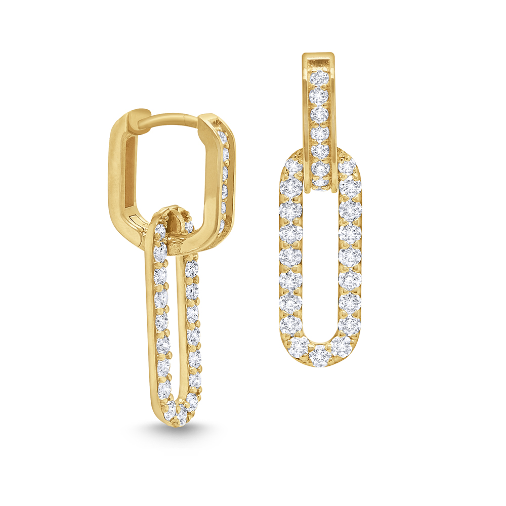 Diamond paperclip charms dangle below modern rectangular mini hoops...a fresh new modern look to add to your diamond earring collection.