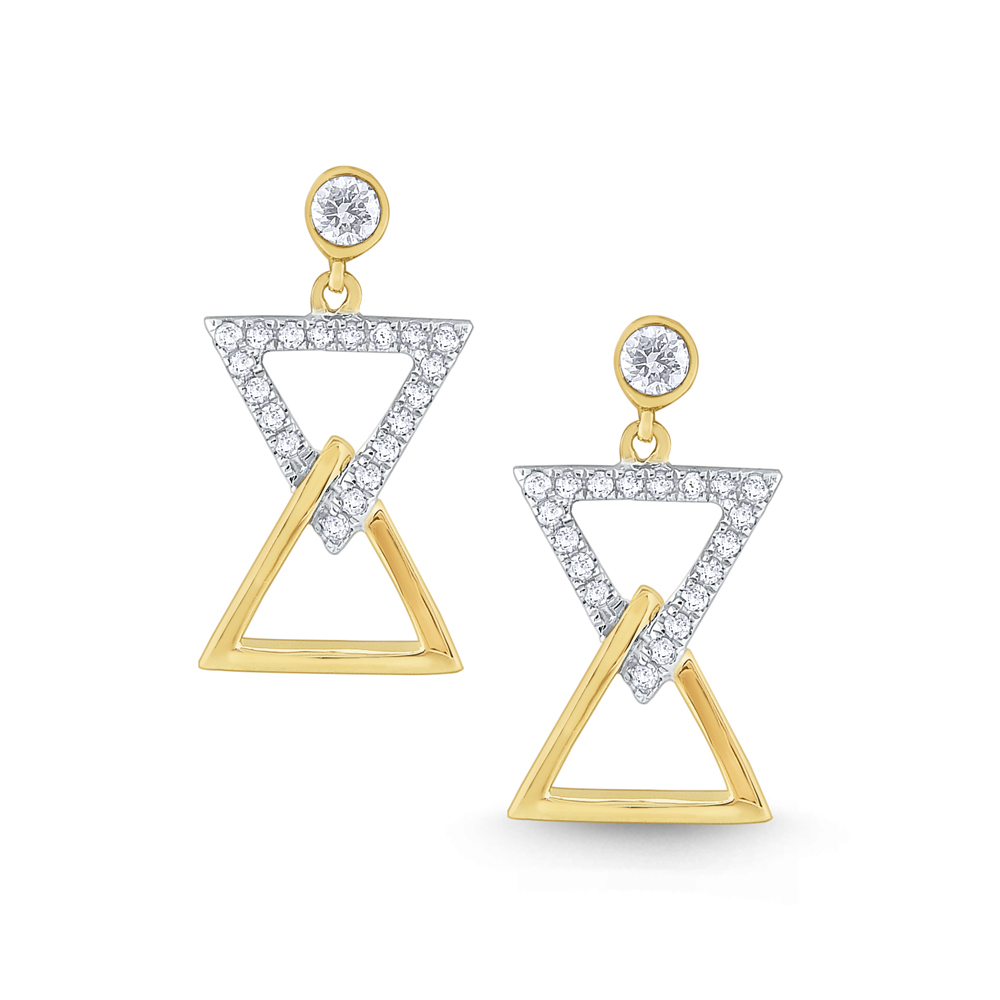Gold and diamonds form a two tone bowtie earring that delicately swings below the ear.