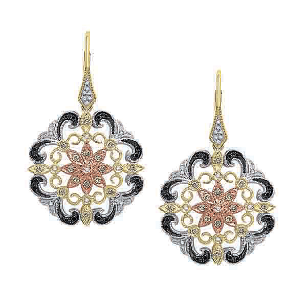Black, Champagne And White Diamond Fashion Earrings in 14k White, Yellow and Rose Gold with 96 Diamonds weighing .70ct tw.