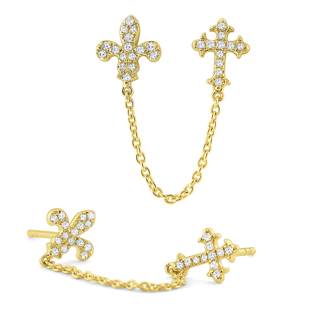 Show your faith and your modern style with this cross and fleur-de-lis earring made for two piercings. Sold as a single earring.