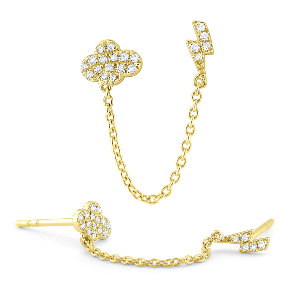An adorable diamond cloud and lightning bold stud earrings are connected by a golden chain.
