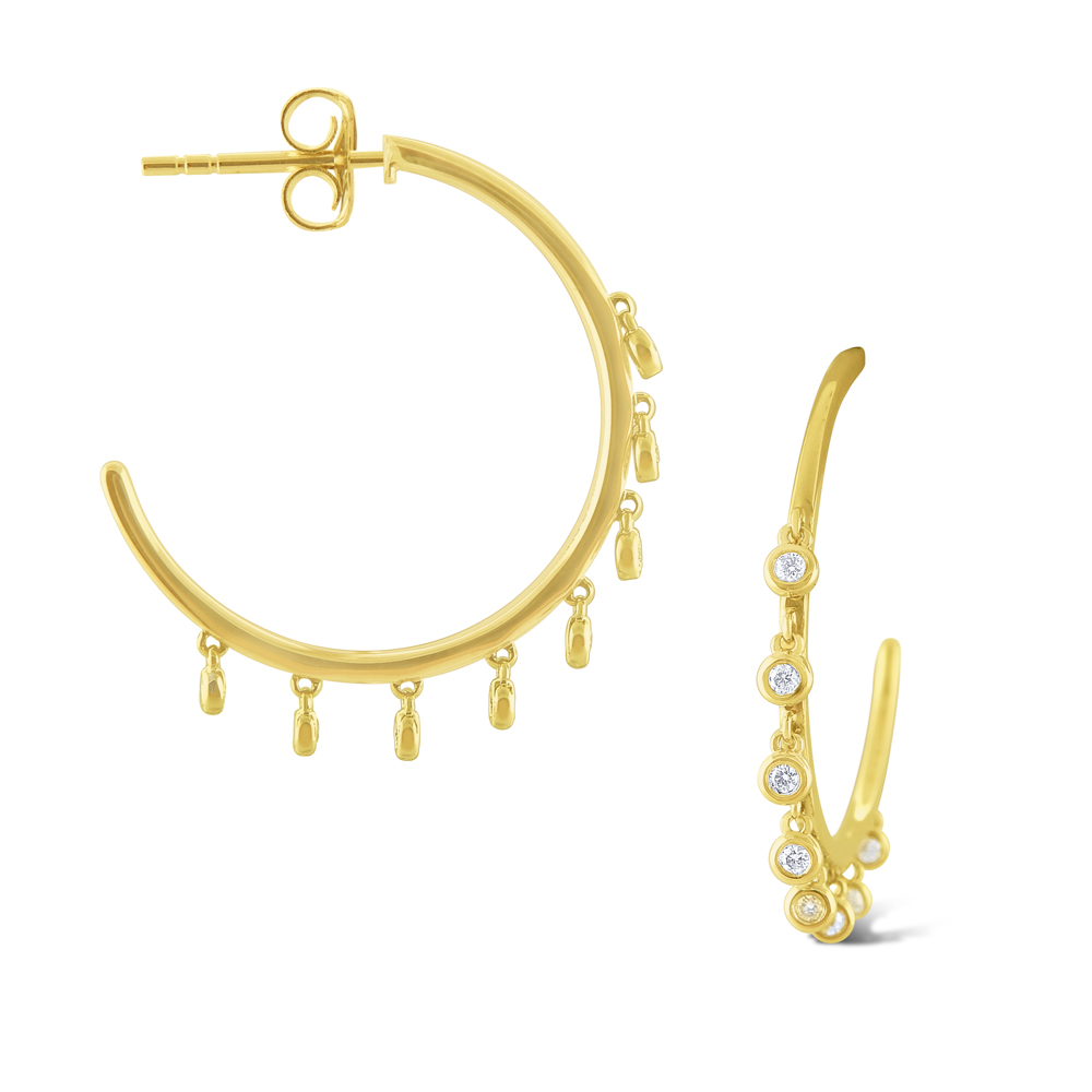 Bezel set diamonds dance along a golden hoop, adding sparkle to your holiday style.