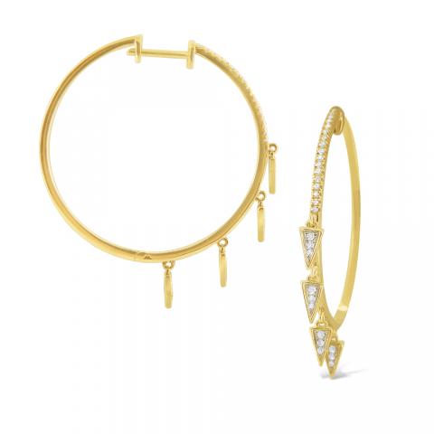 Diamond triangle charms playfully dangle off golden hoops. Wear them solo or jazz up the look with other KC hoops in your second, third, or fourth ear piercings.