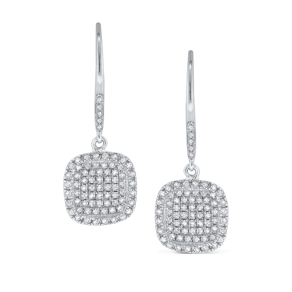 Diamonds dazzle in these simple cushion shape earrings that delicately dangle below the ear.