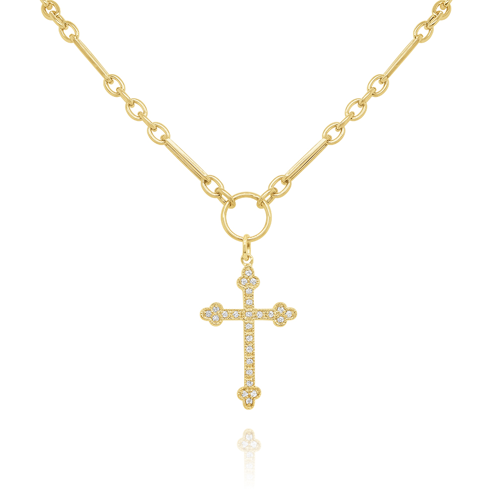 A baroque style cross hangs below a bold link chain making quite a statement.
