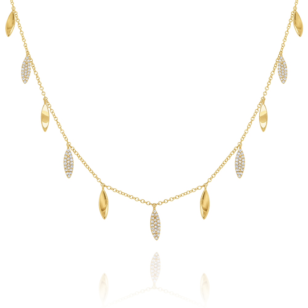 Golden leaves set with sparkling diamonds playfully dance below an adjustable chain. Perfect for layering.