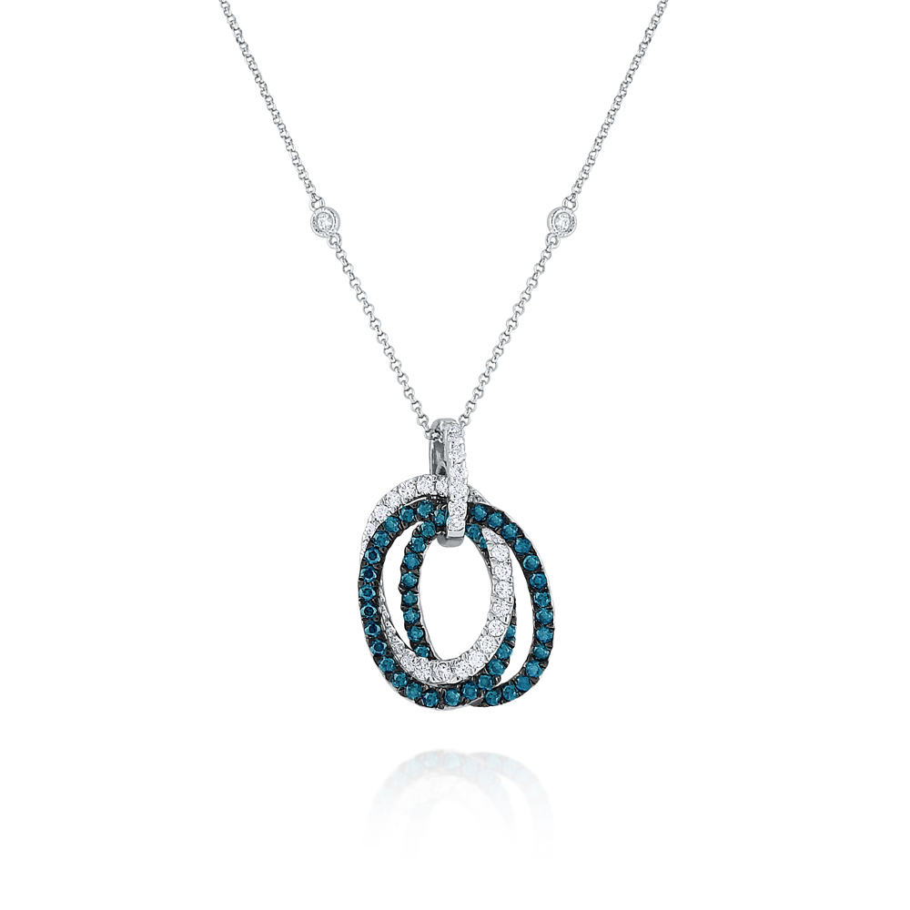 Unique and stunning, blue and white diamonds dazzle in this triple rolling oval necklace on a diamond accented chain.