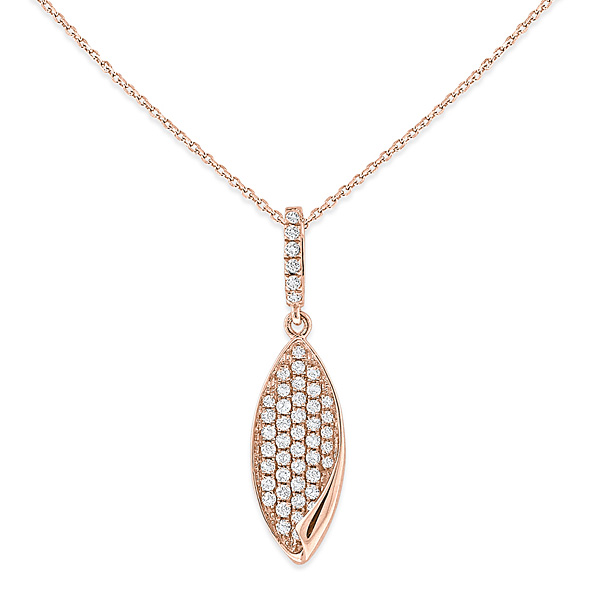 The unique and creative design of this diamond fashion necklace is truly striking and it will garner a lot of compliments whenever you wear it. It contains 49 glinting diamonds with a carat total weight of .32. This beautiful and original piece of finely crafted jewelry art is shown here in flattering and feminine rose gold.