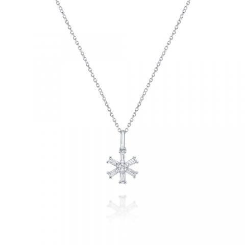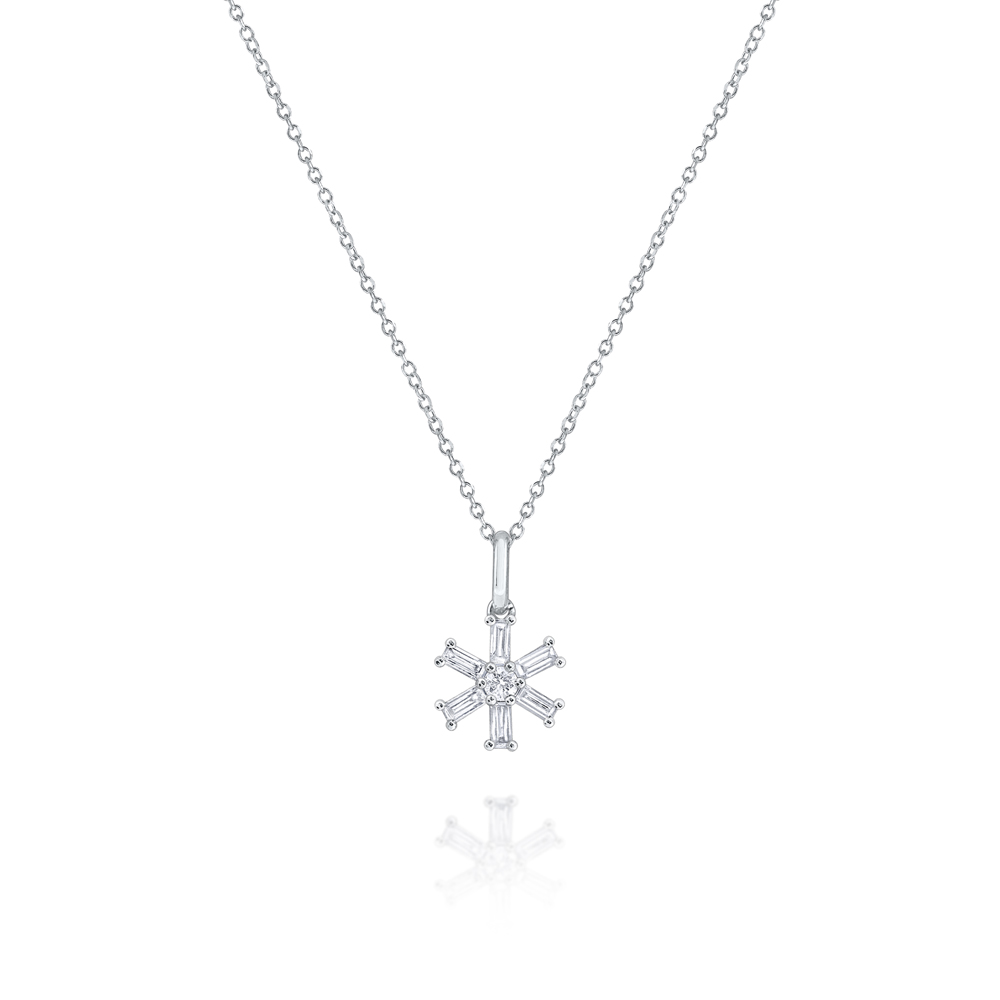 Six baguette cut diamonds arranged in a floral design make for a beautiful feminine pendant.