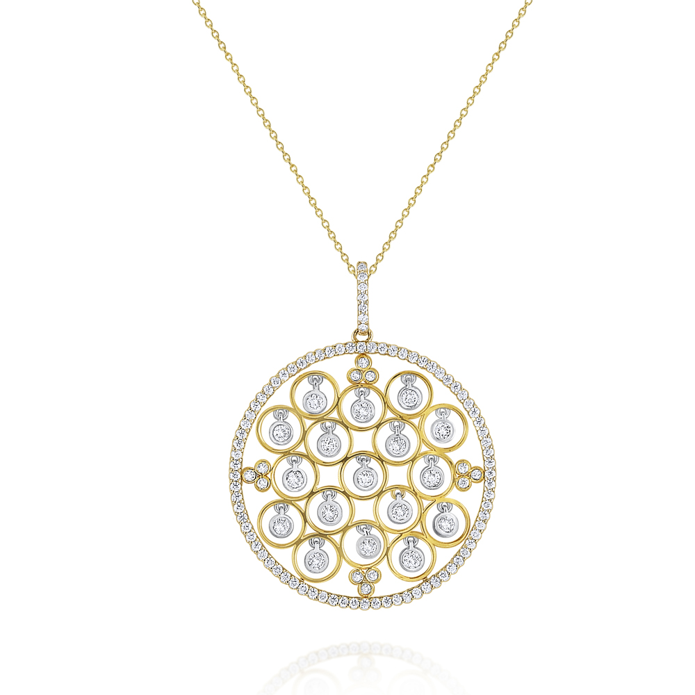 An intricate cut out pendant held by a beautiful 14K yellow gold chain makes for this complementary two toned piece.
