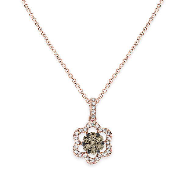 Let this gorgeous champagne and white diamond flower necklace bloom and give a touch of glamour to your look. It is radiant with the light of 36 beautiful .32 ct tw diamonds and its intricate design reveals skilled craftsmanship. It is pictured here in rose gold and it is a truly unique and brilliant piece to add to your jewelry collection.