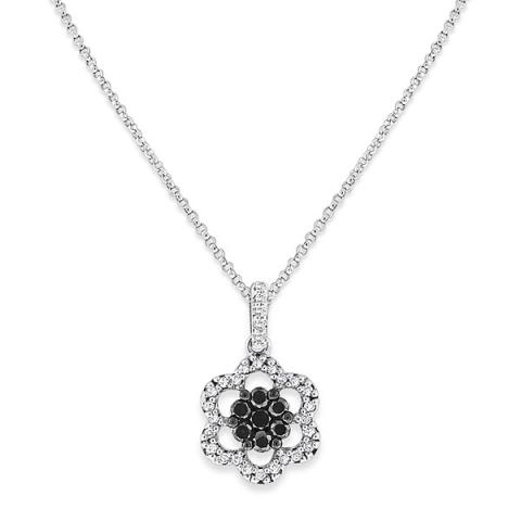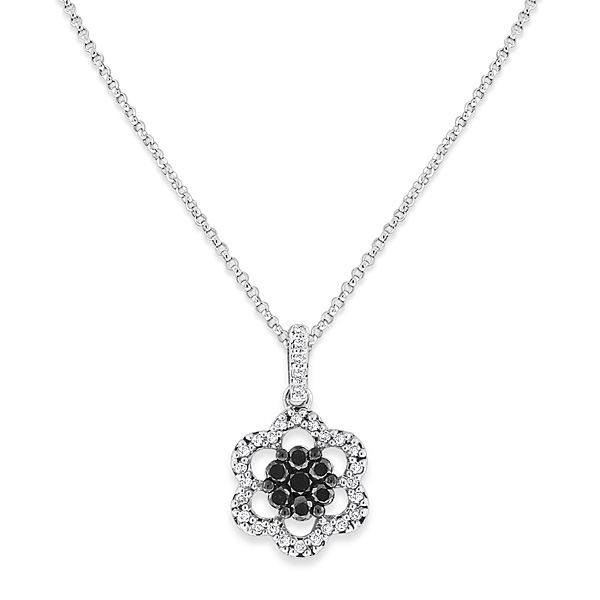 The design of this black and white diamond flower necklace is dramatic and stunning and contains 36 glimmering .32 ct tw diamonds that sparkle and shine as the light plays across their surfaces. It's design is fun and playful, but it's superb craftsmanship and high quality materials give it sophistication. It is pictured here in white gold.