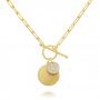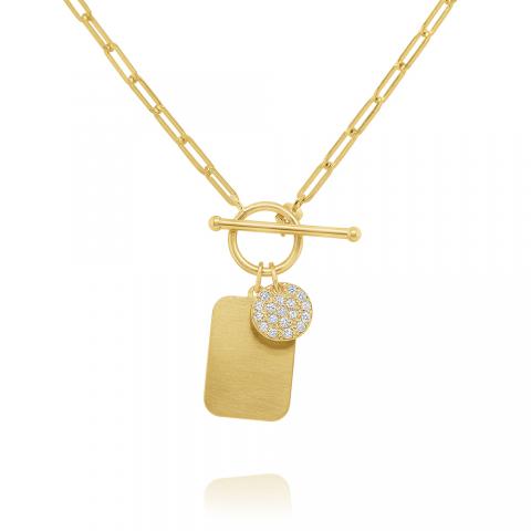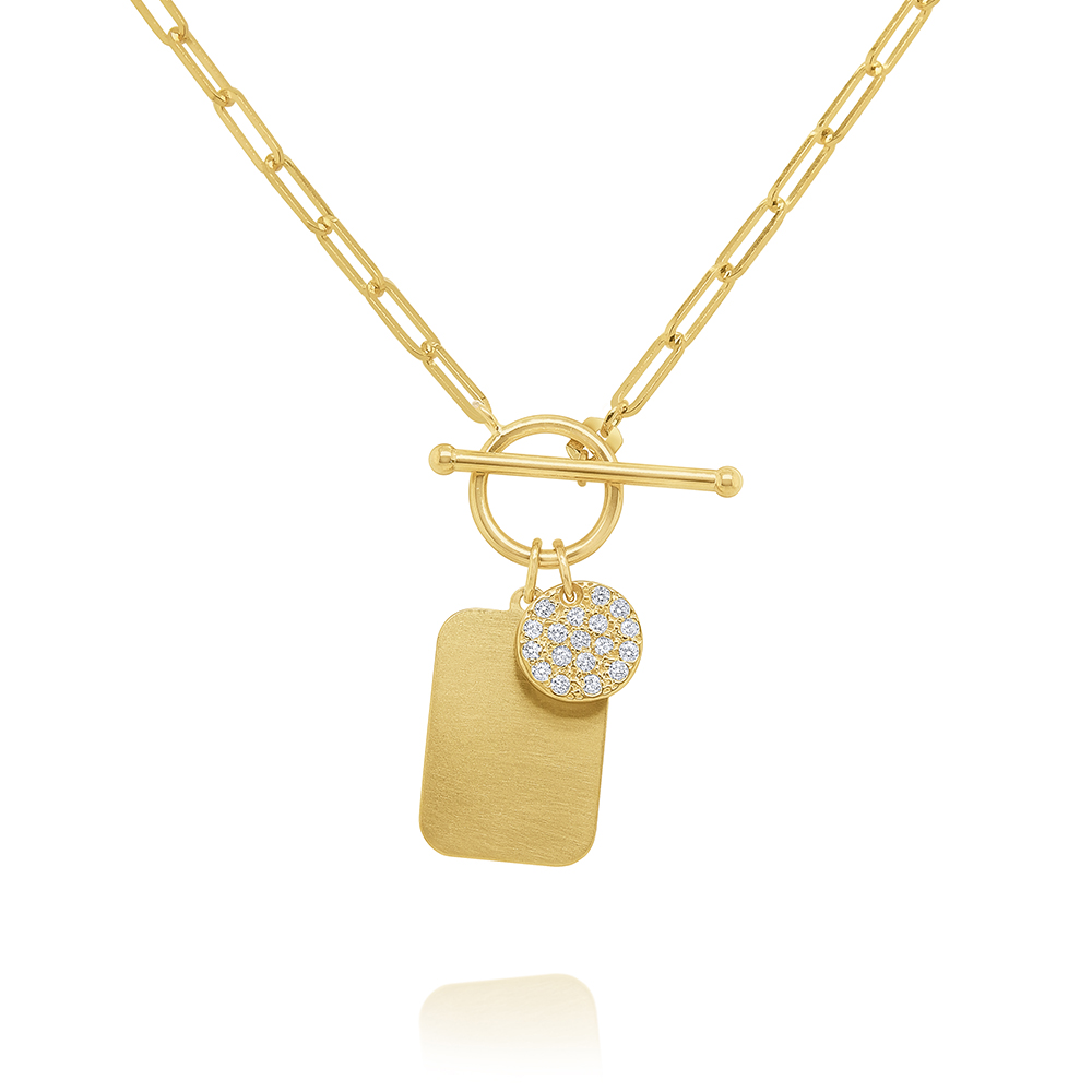 A diamond pave disc with an engravable tag hang playfully off a paperclip toggle chain.