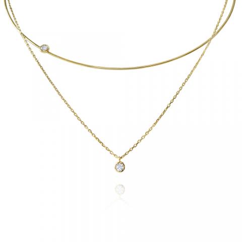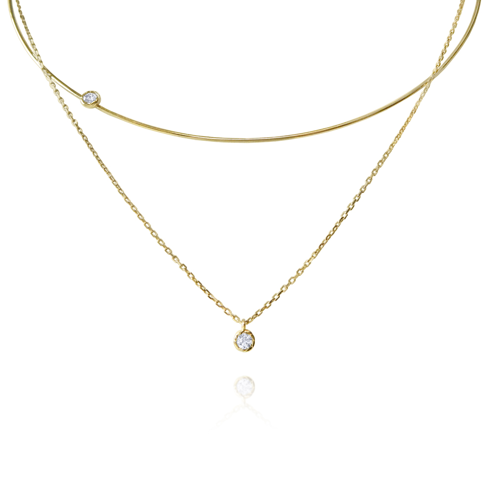A slim 14K gold bar and delicate chain come together to make this layered, trendy look complete with a dangling diamond pendant.