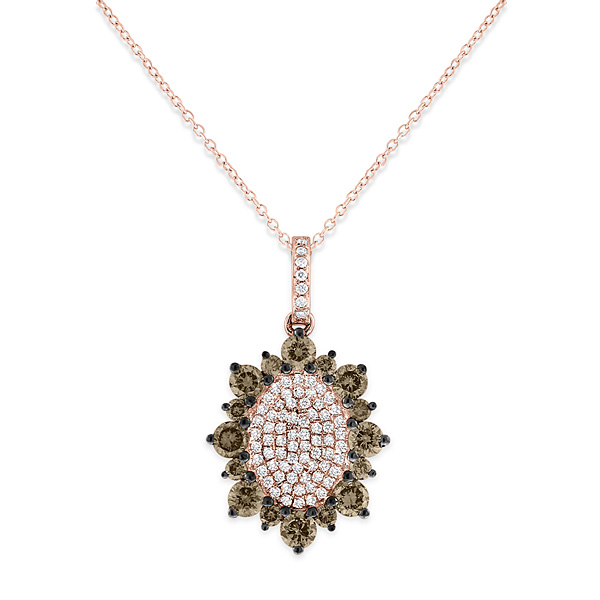This stunning necklace has a creative and dramatic sunburst design that really stands out from the rest. Wearing this champagne and white diamond drop necklace will certainly attract attention and compliments toward you as everyone will be fascinated by it's sparkle. It contains 93 gorgeous .94 ct tw diamonds and is shown in rose gold.