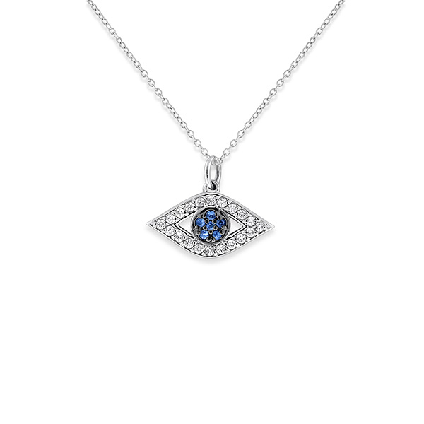 In the tradition of many ancient cultures, including in the Mediterranean and the Middle East, this amulet is worn to protect oneself from the bad energy of the 'evil eye', which is a curse that can bring illness and harm. this stunning blue sapphire and diamond evil eye necklace features 26 twinkling .22 ct tw diamonds and is shown in white gold.