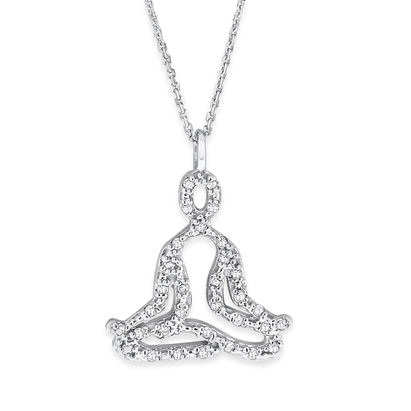 Let your yoga enthusiast know how much you respect their quest for control of mind, body and spirit with this beautiful diamond encrusted pendant. With a constant reminder of your love around her neck, you will be her favorite guru. Set in 14K white gold, this elegant piece is adorned with 32 diamonds weighing .11cts tw.