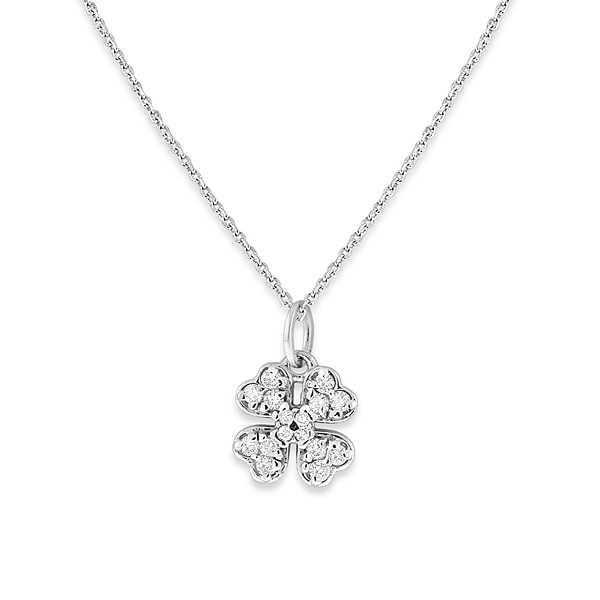 Good things come in small packages and this diamond small clover necklace is just the right size to be sweet and feminine but not too large or overpowering. The fun and charming clover shape means that it will bring you good luck and the 16 stunning .14 ct tw diamonds will sparkle and dazzle. It is pictured here in classic white gold.