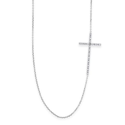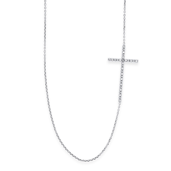 Express your faith with your chic and stylish jewelry, in a hip and modern way. This diamond sparkle on the side cross necklace stands out from the others because it features an asymmetrical design with the cross on the side. It shimmers with 17 sparkling .17 ct tw diamonds and it is shown here in 14 k white gold.