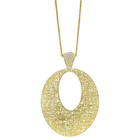 The jewelry in the Aria collection is truly stunning, as it is a blend of playful and modern creativity and glitzy glamor. This Aria collection diamond oval drop necklace is bold and geometric while at the same time having a delicate and elegant sensibility. It featured 46 beautiful .22 ct tw diamonds and is shown in yellow gold.