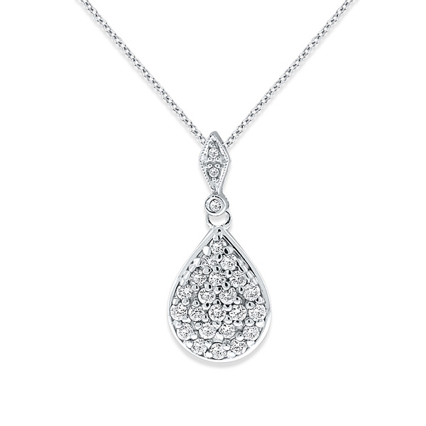 Diamonds are a girl's best friend and sometimes a girl just wants a few glittering diamonds that she can wear around her neck to really dazzle everyone and add glamor and sophistication to her look. This diamond large teardrop with bale necklace contains 25 glimmering .44 ct tw diamonds and is pictured here in elegant white gold.