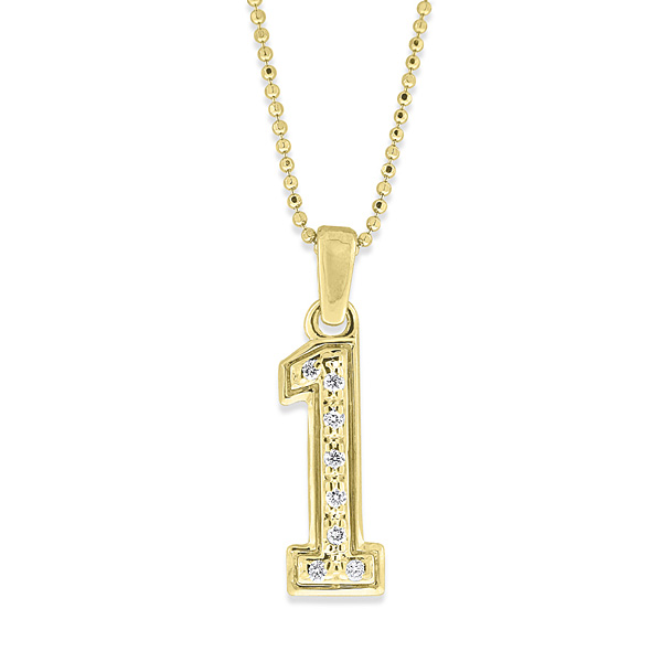 You will feel like number 1 in fashion when you wear this cute and playful diamond jersey number 1 necklace. It has a sporty feel to it but it is still luxurious and feminine, with 8 shimmering .04 ct tw diamonds and a sweet and delicate design. It is pictured here in elegant 14 k yellow gold for a classic look.