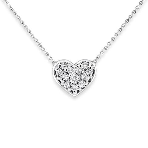 Do you remember your first love? Perhaps the sweet innocence of this beautiful necklace will remind you. This diamond heart necklace glitters with a sweet and romantic sensibility and features 12 delicate .14 ct tw diamonds that give a flirtatious gleam. This lovely necklace is pictured here in white gold.