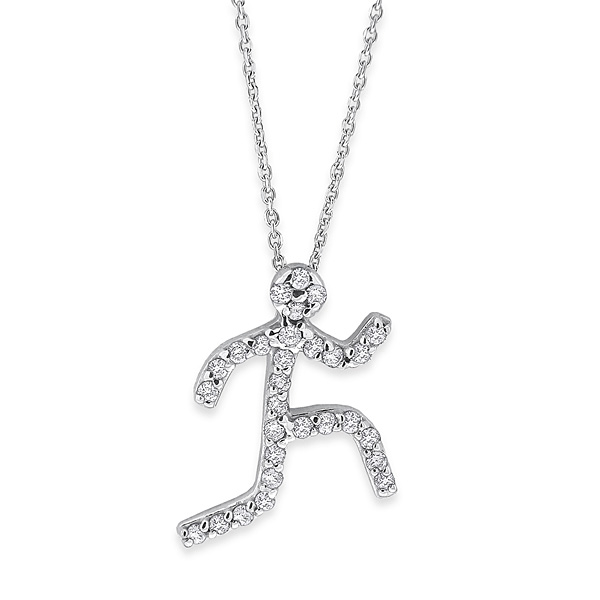 Playful, fun and simply adorable, this diamond large running man necklace makes a great style statement. Whether you love running or you have just fallen head over heels for the quirky and cute design, this necklace is sure to become a favorite. It contains 29 beautiful .15 ct tw diamonds and it is pictured here in elegant white gold.