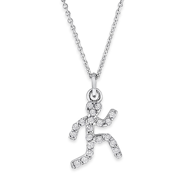 Whether you are a running enthusiast or a lover of cute and creative jewelry, wearing this adorable running man will certainly get you a lot of attention. This diamond small running man necklace contains 20 sparkling .10 ct tw diamonds for a glittering and bold impression. It is pictured here in white gold for a classic and timeless look.